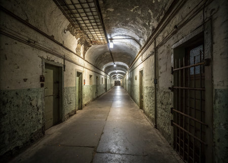 An empty, haunting corridor with rows of cell doors on either side, reflecting the desolation and history of an old, abandoned prison.