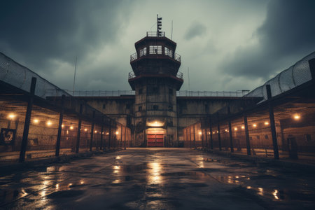 view of a gloomy prison building from the outside, created with generative ai