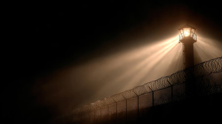 A strong light beams from a guard tower illuminating a prison yard surrounded by a tall barbed wire fence.