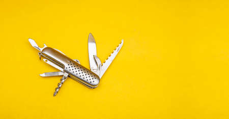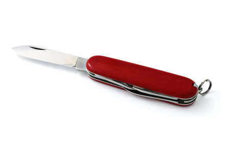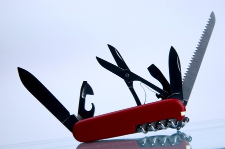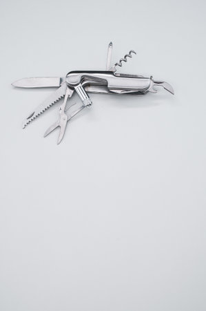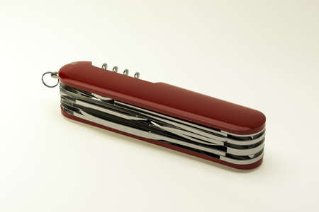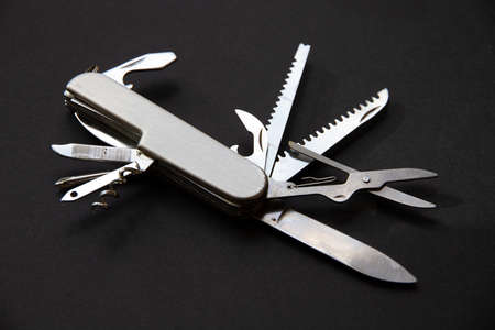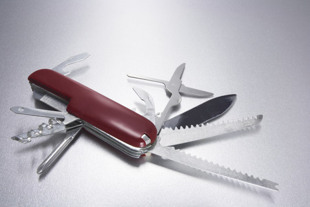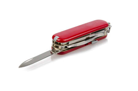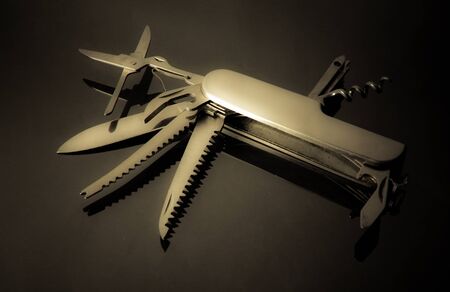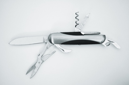 Old Multipurpose knife with all neccessary tools all in one and Isolated on white background