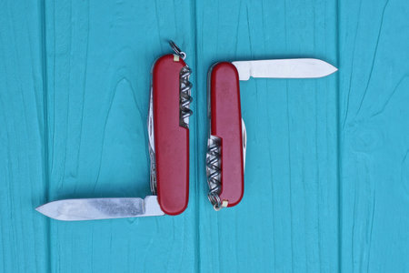 two open folding knives multitools with red handles with gray blades lie on a blue green wooden table