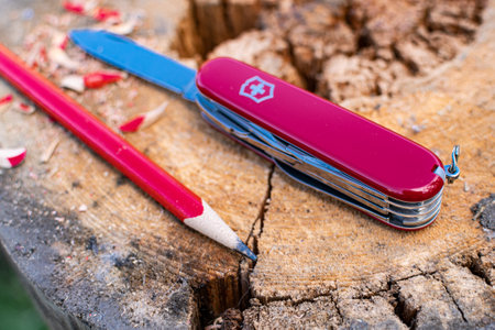Army Swiss folding knife and sharpened red pencil on a wooden stump.