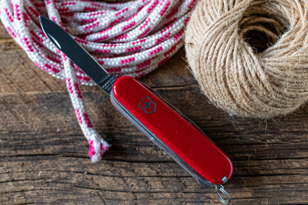 Swiss Knife multi-tool and ropes on an old wooden table. A portable, reliable tool.