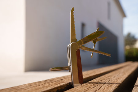 Multipurpose knife on wooden background with all neccessary tools all in one