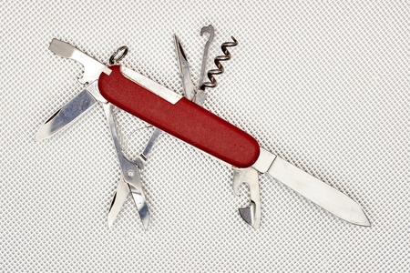 Red all purpose pocket knife on a rustic wooden background. Top view
