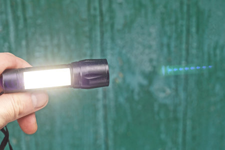 hand holds a one small luminous black metal flashlight on a green background wall in the street