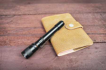 leather bag an fashioned flashlight, on wooden background