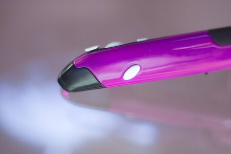 LED flashlight on a purple background. Close-up. Selective focus.