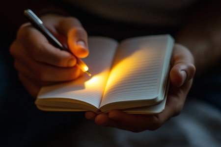 Soft light illuminates a small notebook held in hands, with a pen creating a warm glow as it touches the page. The atmosphere feels intimate and creative, encouraging reflection.