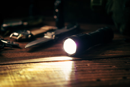Tactical waterproof flashlight. LED flashlight shines on the table in smoke..