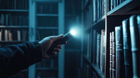 A flashlight beam held by a hand exploring the shelves of a dark, eerie library.