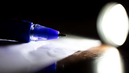 Close-up of a ballpoint pen on a table in the light of a lantern. Macro