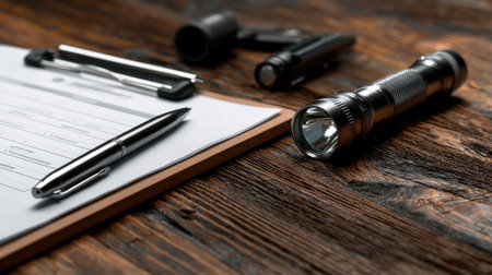 A pen, a flashlight, and a pen holder sit on a wooden table. The pen holder is empty, and the pen is on top of the paper. The scene is simple