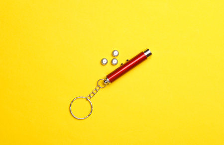 Laser pointer flashlight with batteries on yellow background