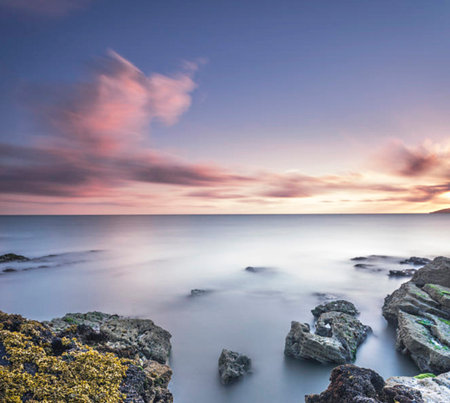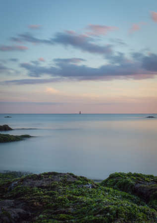 Twilight begins yielding to daylight at St. Johns Point Lighthouse. Rocky coastline with blurred water and sky, long exposure photography