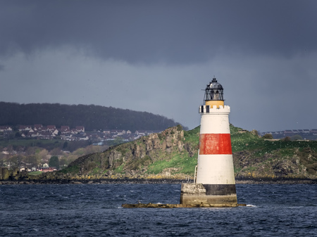 Oxcars white and red lighthouse in Scotland during sun splash against dark shore background