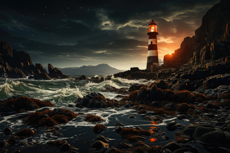 An AI generated illustration of a tranquil scene of a lighthouse at the beach during a stunning sunset, surrounded by rugged rocks