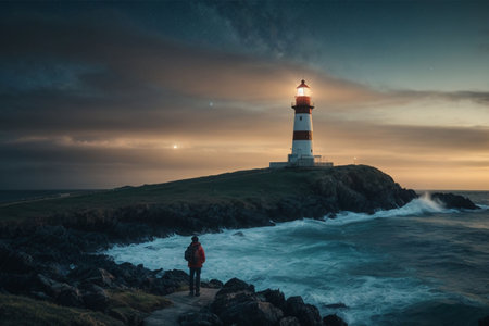 Old lighthouse against dark sky, thunderclouds rolling in, waves crashing against jagged rocks below, man figure