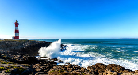 A vibrant red and white lighthouse stands prominently on a rugged coastline as powerful ocean waves crash against the rocks under a clear blue sky on a sunny day.