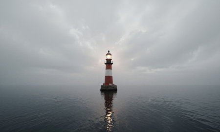 A solitary lighthouse shining its light across a dark, calm sea, providing guidance and safety during the night. High quality photo