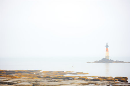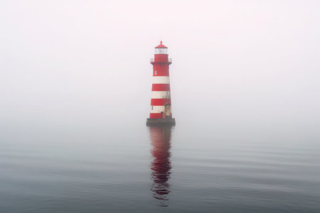 A solitary lighthouse glowing in the center of a calm sea of mist, symbolizing guidance, safety, and hope during uncertain