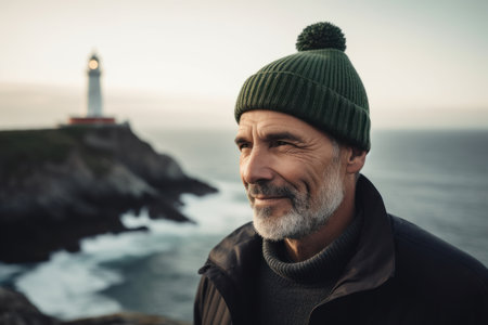Handsome senior man with gray beard wearing warm hat and scarf standing at the edge of the cliff with a lighthouse in the background.