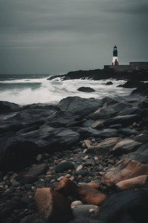The lighthouse stands as a steadfast sentinel offering a beacon of hope amidst the coastal wilderness. The contrast between the sturdy structure of the lighthouse and surroundings
