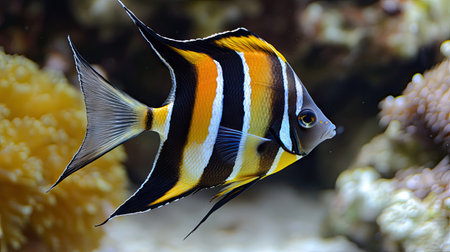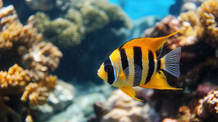 Amazing striped yellow fish swimming underwater on coral reefs background. Tropical sea bottom. Colorful nature calming background.