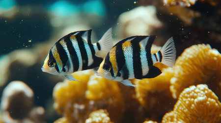 Explore a stunning underwater tableau that showcases vibrant striped fish gracefully swimming through a rich coral reef, highlighting the beauty of marine life and ecosystems.