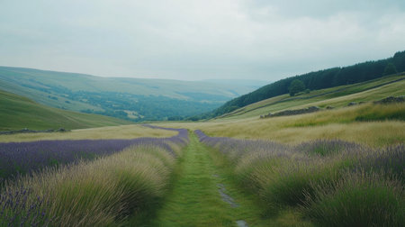 A breathtaking view of rolling hills adorned with blooming lavender fields, complemented by a tranquil pathway under a soft, overcast sky.