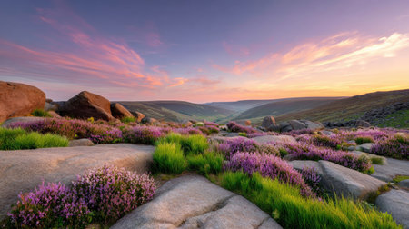 Experience the beauty of a serene countryside at sunrise, with vibrant heather and rocky formations bathed in soft morning light.