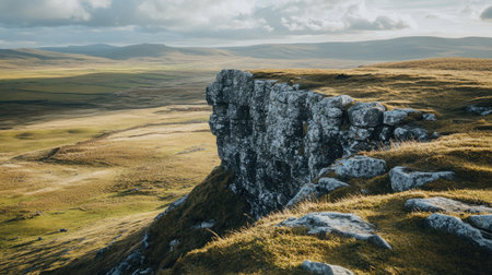 the crag in yorkshire stands majestically amidst the rolling hills and lush greenery of the english countryside, its rugged surface a testament to the region's rich geological history, beckoning rock climbers and hikers to explore its challenging routes and breathtaking vistas. ai generated