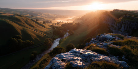 Sunrise illuminates lush valley with flowing river and gentle hills in the countryside