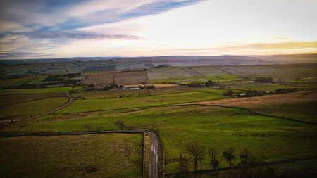 Aerial view of endless lush pastures and farmlands of England. Beautiful English countryside with emerald green fields and meadows. Rural landscape on sunset.