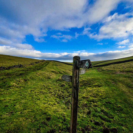 A wooden sign post at the side of a dry stone wall, with open moorland and a mountain in the distance. Billowing clouds signify that this a a lovely day. Scar house reservoir. Yorkshire Dales