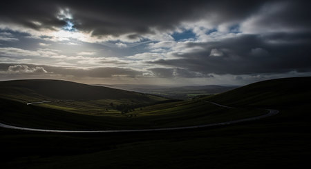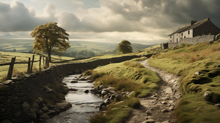 yorkshire's breathtaking panorama unfolds with rolling hills, lush green pastures, and rustic stone walls, showcasing the picturesque countryside's serene beauty, perfect for hikers and nature lovers, with the majestic north york moors and yorkshire dales national park serving as a stunning backdrop. ai generated