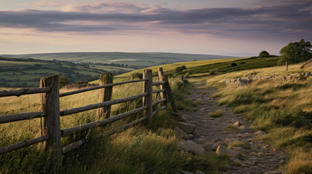 a fence stands in a field beneath a serene sky, reminiscent of traditional british landscapes. the soft atmospheric lighting showcases the gentle hues of light pink and dark amber. captured with iso 200, the image portrays a dreamy ambiance in shades of light indigo and light green. this elaborate landscape is presented in stunning 32k uhd resolution. ai generated
