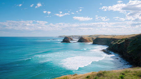 A stunning coastal view featuring dramatic cliffs and rolling waves under a bright blue sky with fluffy clouds. Perfect for travel and nature themes.