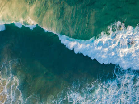Top down view of giant ocean waves crashing and foaming