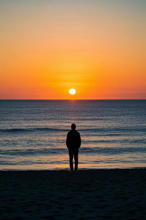Young man standing on the beach and looking at the sea at sunset