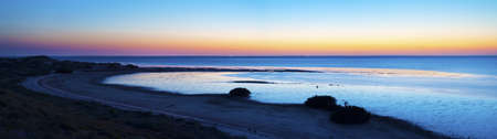 A panoramic view of a beach and the horizon at sunset.