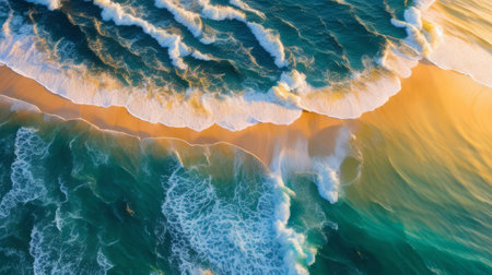 A breathtaking aerial view showcasing a pristine beach kissed by golden sunlight, with sparkling turquoise sea water and gentle waves, perfectly capturing the essence of relaxation and coastal