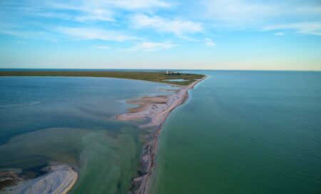 Aerial view of seashore with beach, lagoons and coral reefs. Coastline with sand and water. Tropical landscape. Aerial photography. Birdseye. Sea, beach, sky, clouds.