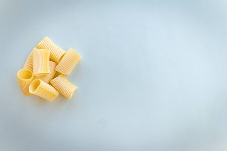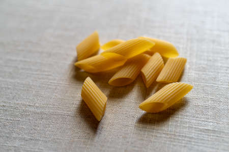 Uncooked pasta on neutral background. Meal based on flour. Italian healthy food.