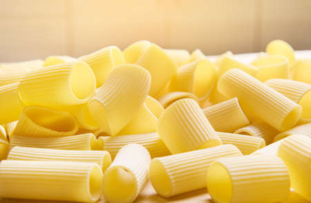 Abstract top view of yellow big tubes of raw cannelloni Italian pasta. Food art style. Macro shot