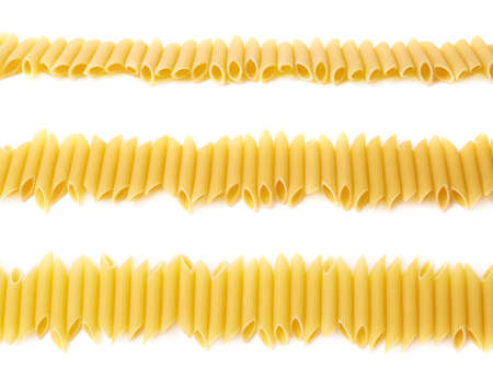 Multiple dried yellow penne pasta noodles lined up in a row, composition isolated over the white background, set of three different foreshortenings