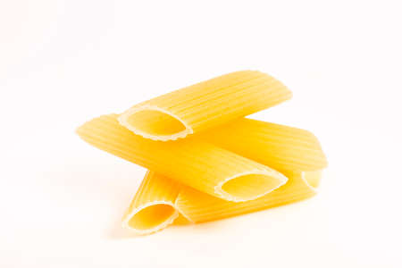 Raw feathers macaroni. Italian pasta close-up on the white background.