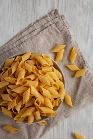 Uncooked Organic Penne Pasta in a Bowl, overhead view. Flat lay, top view, from above. Copy space.
