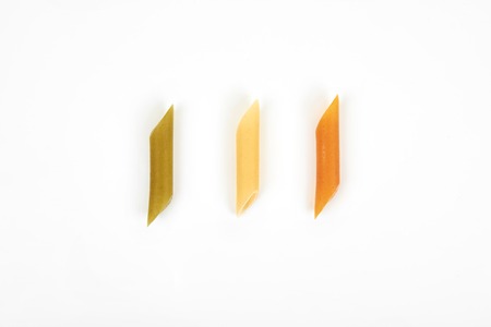 raw penne colorful pasta on white background.