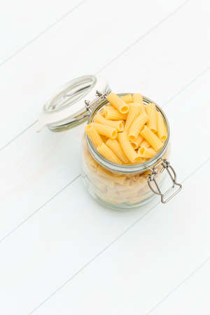 Raw tortiglioni pasta on a glass jar on blue wood table